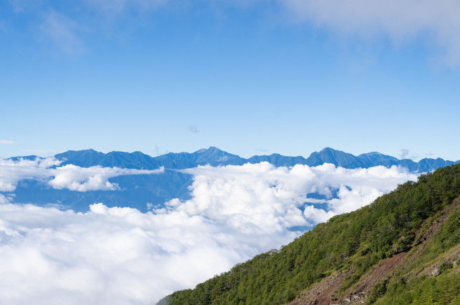 雨上がりにガスが晴れ、雲上にだけ姿を現す高峰を見ながら登る